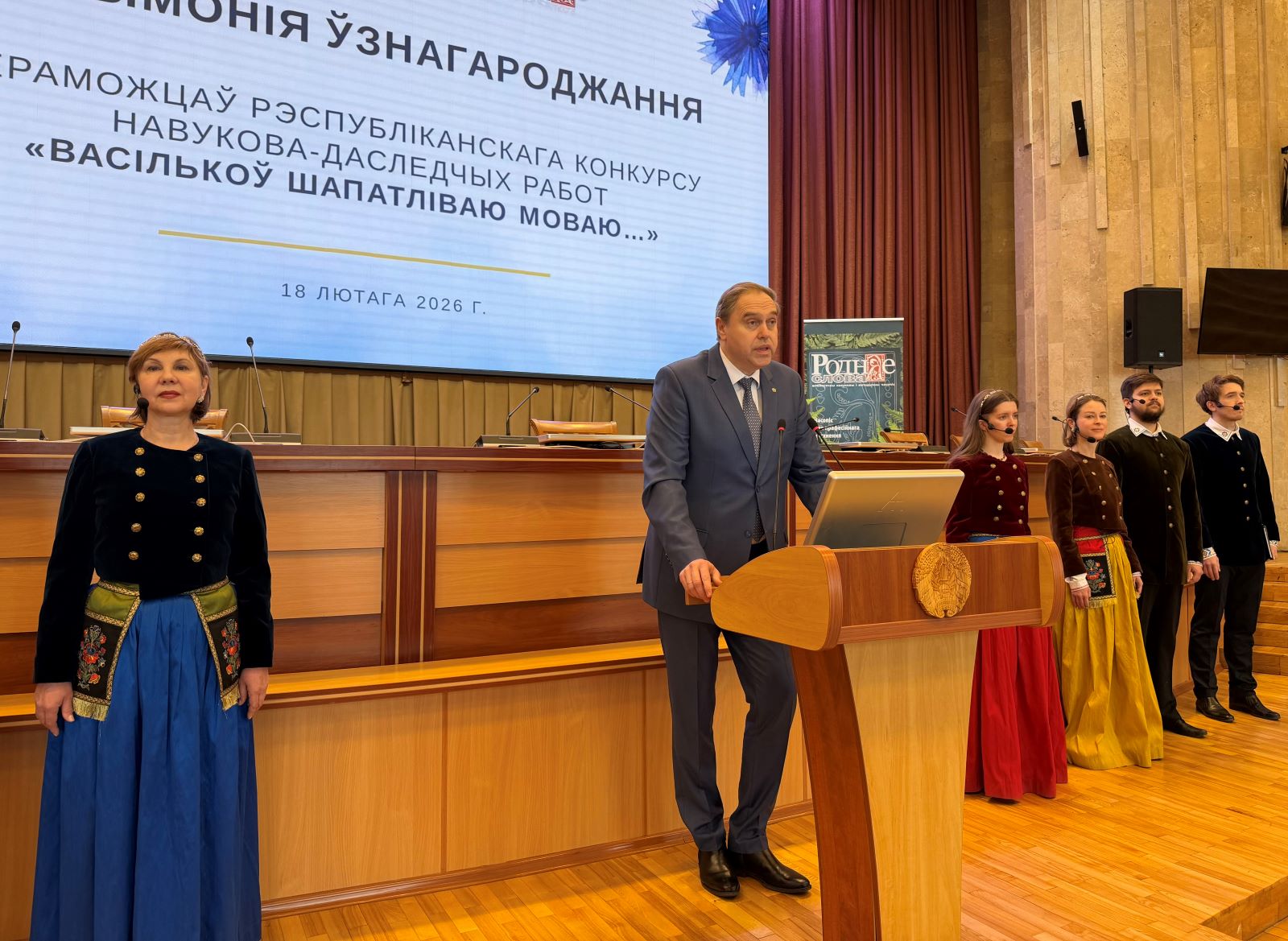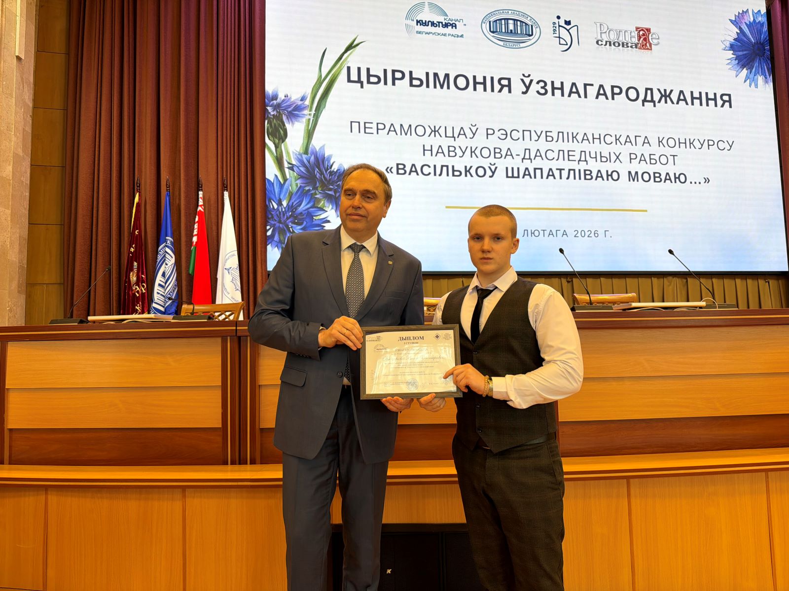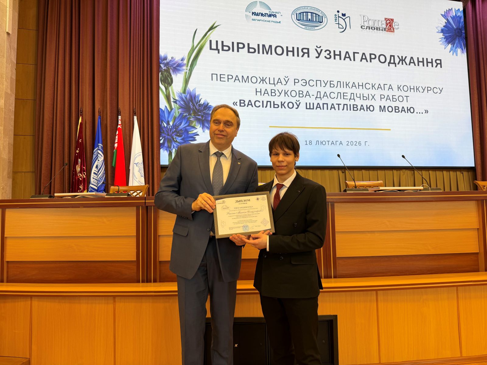 У Нацыянальнай акадэміі навук Беларусі 18 лютага адбылася ўрачыстая цырымонія ўзнагароджання пераможцаў Рэспубліканскага конкурсу навукова-даследчых работ «Васількоў шапатліваю моваю...», прымеркаванага да Міжнароднага дня роднай мовы. Дыпломы і каштоўныя прызы пераможцам – 60 канкурсантам з усіх рэгіёнаў краіны – уручыў Старшыня Прэзідыума НАН Беларусі Уладзімір Каранік.